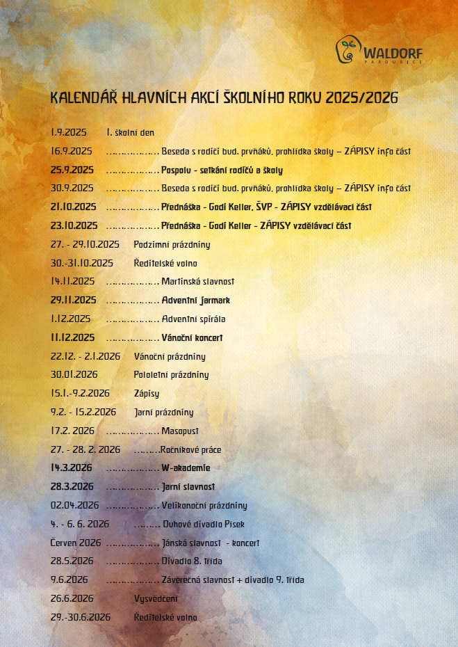 Zde se dostanete na neoficiální kalendář akcí školy. Oficiálním elektronickým kanálem školy pro zákonné zástupce je Edookit. V případě technických obtíží nás kontaktujte emailem na edookit@waldorfpardubice.cz nebo telefonicky na 776078125.