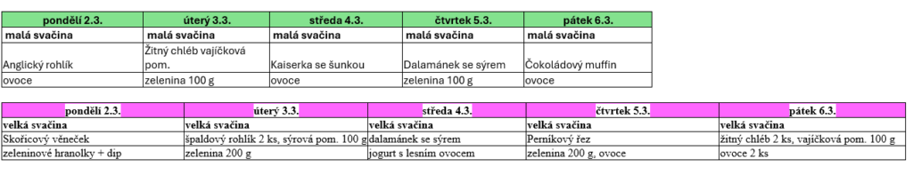 Svačinky můžete objednávat na týden dopředu vždy do čtvrtka 24 hodin prostřednictvím TOHOTO odkazu.